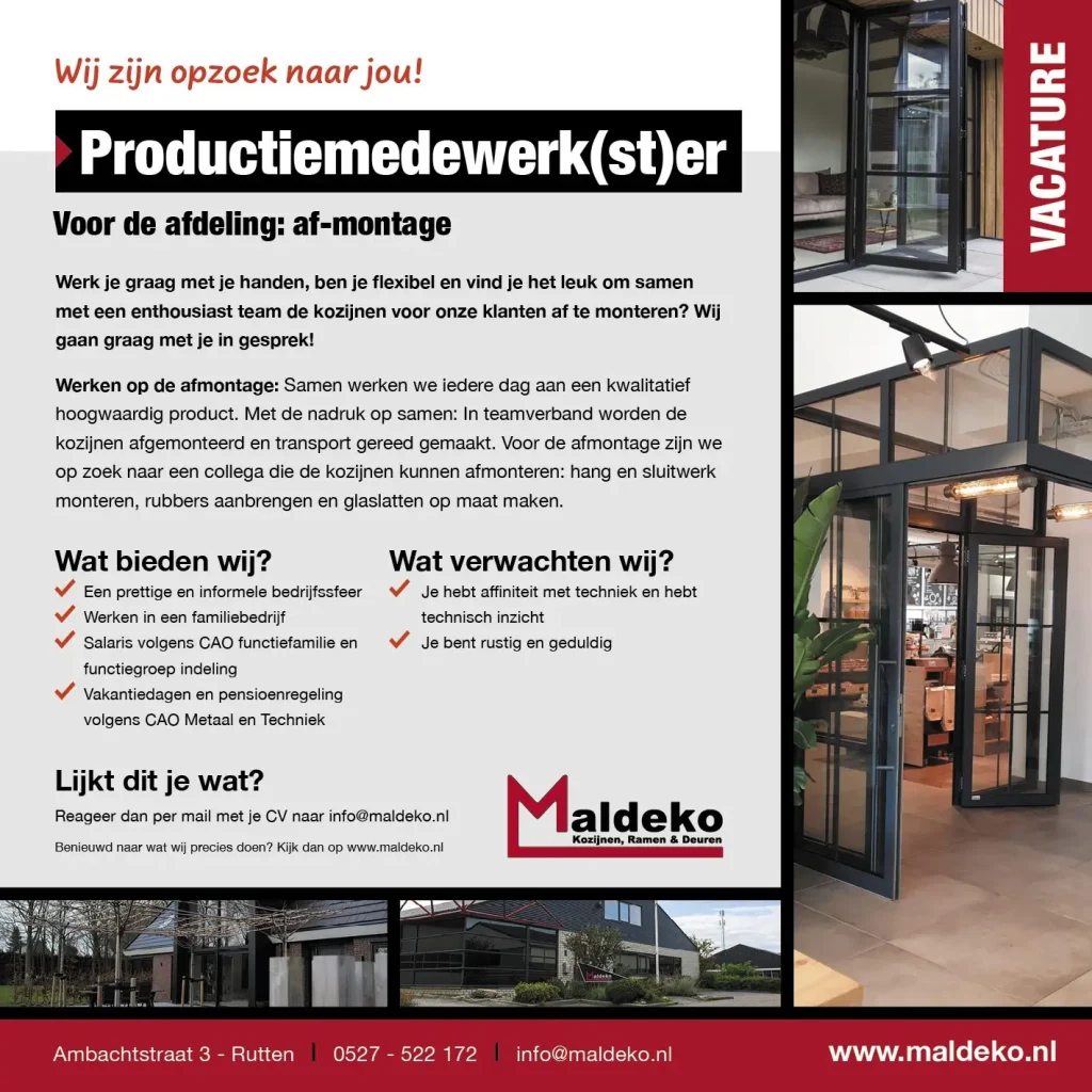 Hou jij van werken met je handen en vind je het tof om echt iets te maken? Kom bij ons in de fabriek aluminium kozijnen produceren.